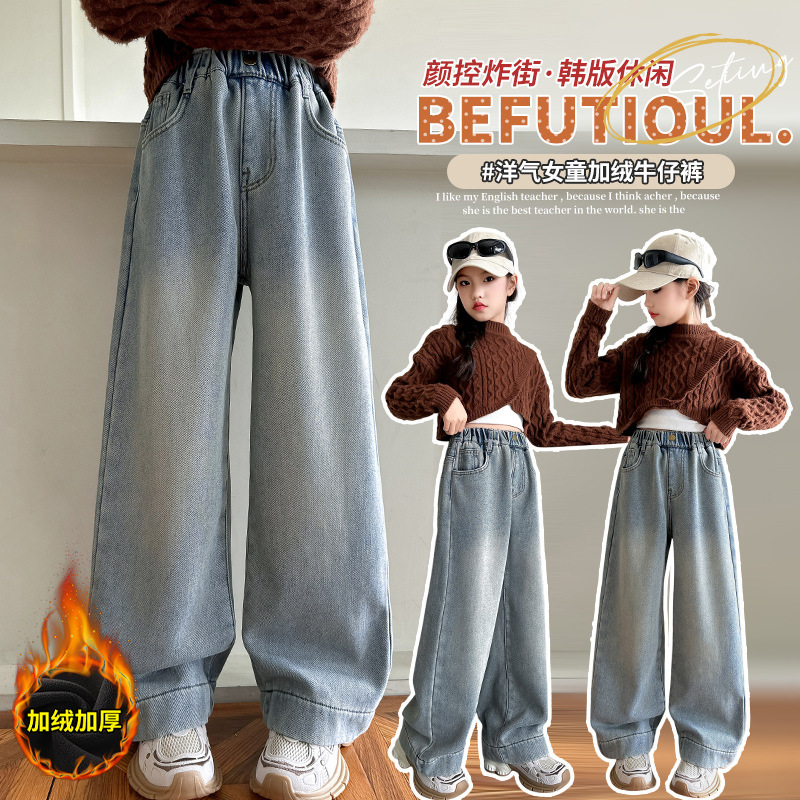 女の子とベルベットのジーンズ2024冬の新しい子供のファッション的な空気が厚くてゆるいストレートなズボンの子供