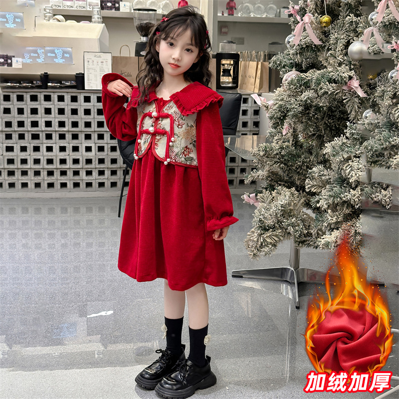 女の子の新年のワンピース秋冬2024年の新しいサイズの子供の女の子のベルベットの赤いお祝いの新年のスカートの字