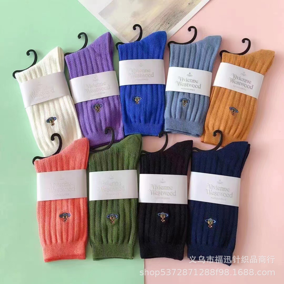日系土星西太后靴下双針刺繍純色綿混中筒シンプルなスタッカファッション靴下学院風