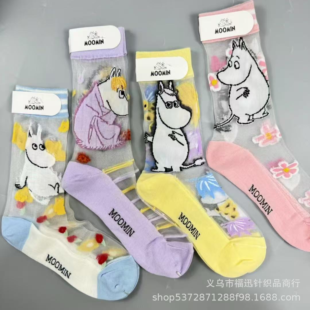ヨーロッパとアメリカのトレンディな夏ムーミンヤミン薄い透明ガラスシルク女性の靴下漫画かわいい甘いミッドチューブクリスタルシルクトレンディな靴下