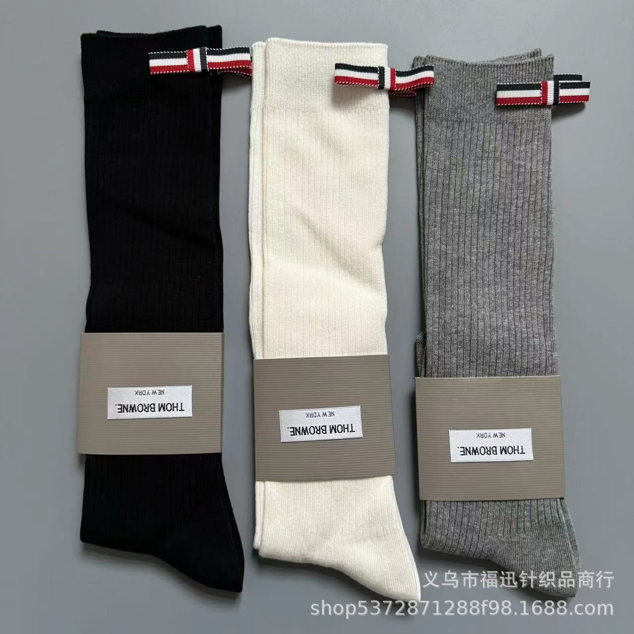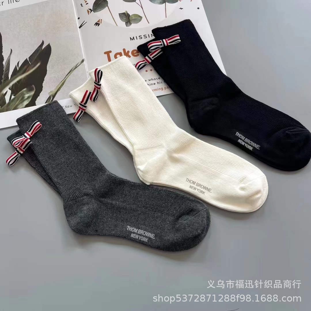 新品tb蝶結び黒白灰純色双針中筒靴下綿靴下甘美百合靴下ins日系学院