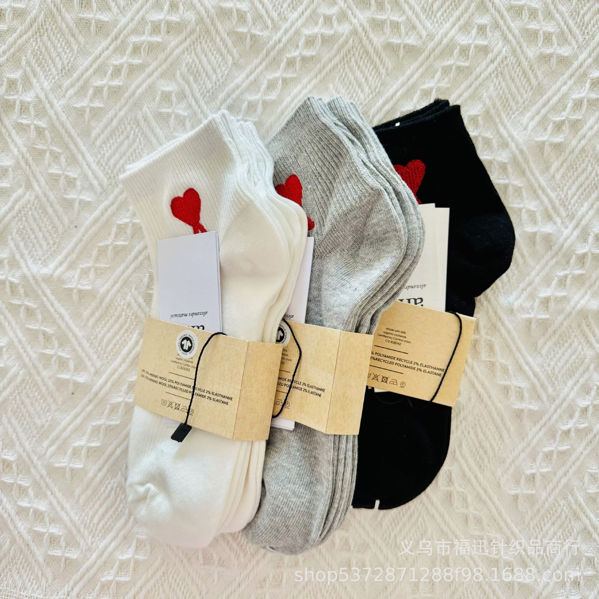 新品ハートA刺繍靴下ダブルニードル中短筒黒白グレーシンプルダブルニードルスポーツカジュアルコットンソックスinsファッションソックス