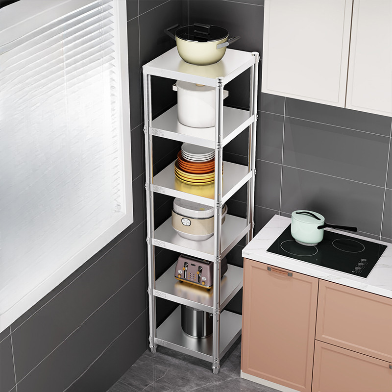 ステンレスの台所の物置棚が床に落ちた家庭用棚の多層電子レンジの物置棚に挟まれて炊飯器を収納する棚