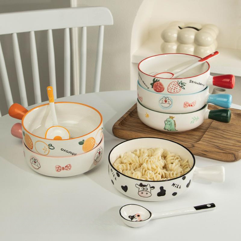 漫画かわいいセラミックハンドルボウル家庭用ハンドル付きベイクドライスボウルヨーグルトボウルクリエイティブフルーツサラダボウルデザートボウル