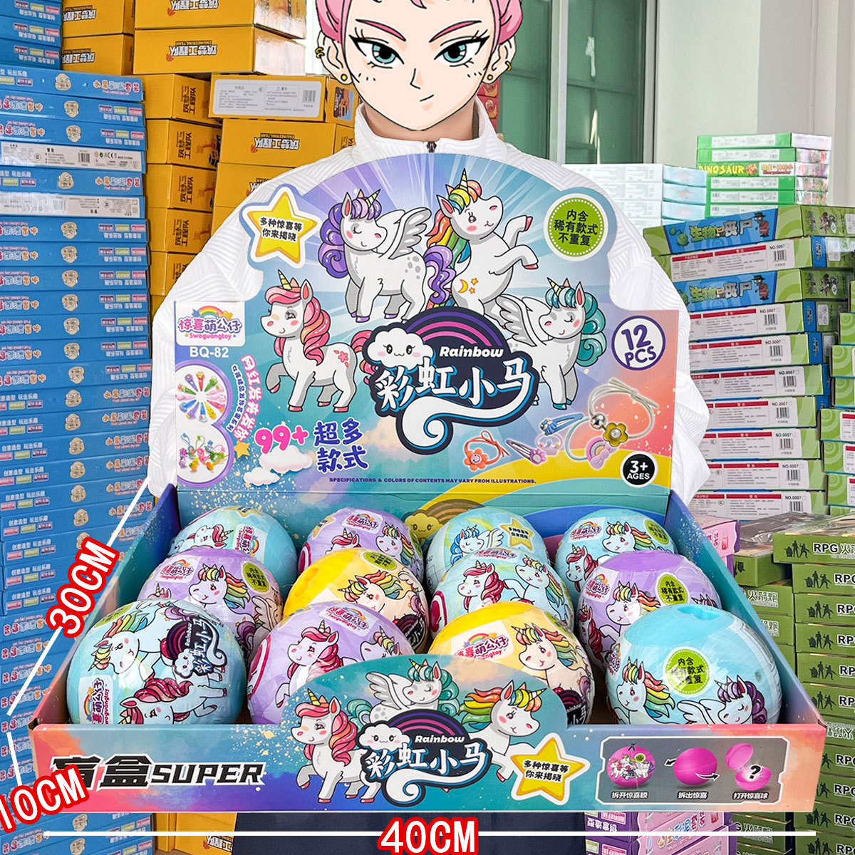 子供の女の子のおもちゃの虹のポニーサプライズボールを解体します。