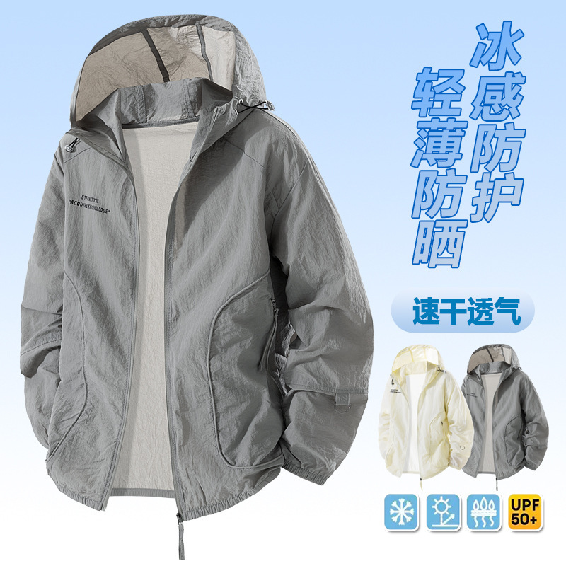 アイスシルク通気性薄い日焼け防止服男性夏 2025 新しいアウトドアカジュアルフード付きジャケット若者の日焼け防止服