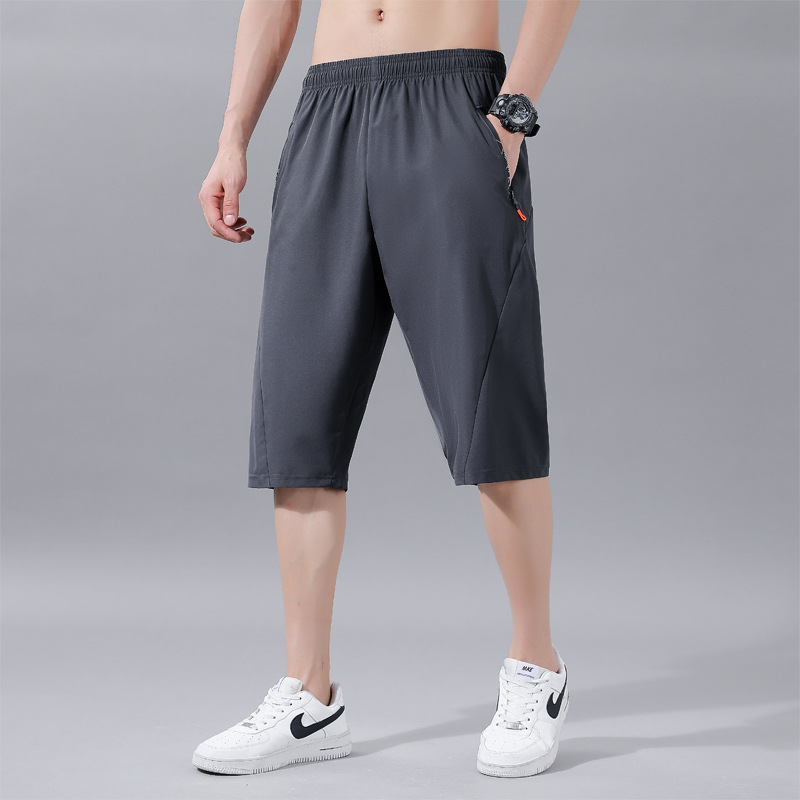 サマーアイススポーツショーツ、サマーランニングスポーツフィットネスメンズパンツ、伸縮性速乾裏地付き七分丈パンツ、伸縮性薄手