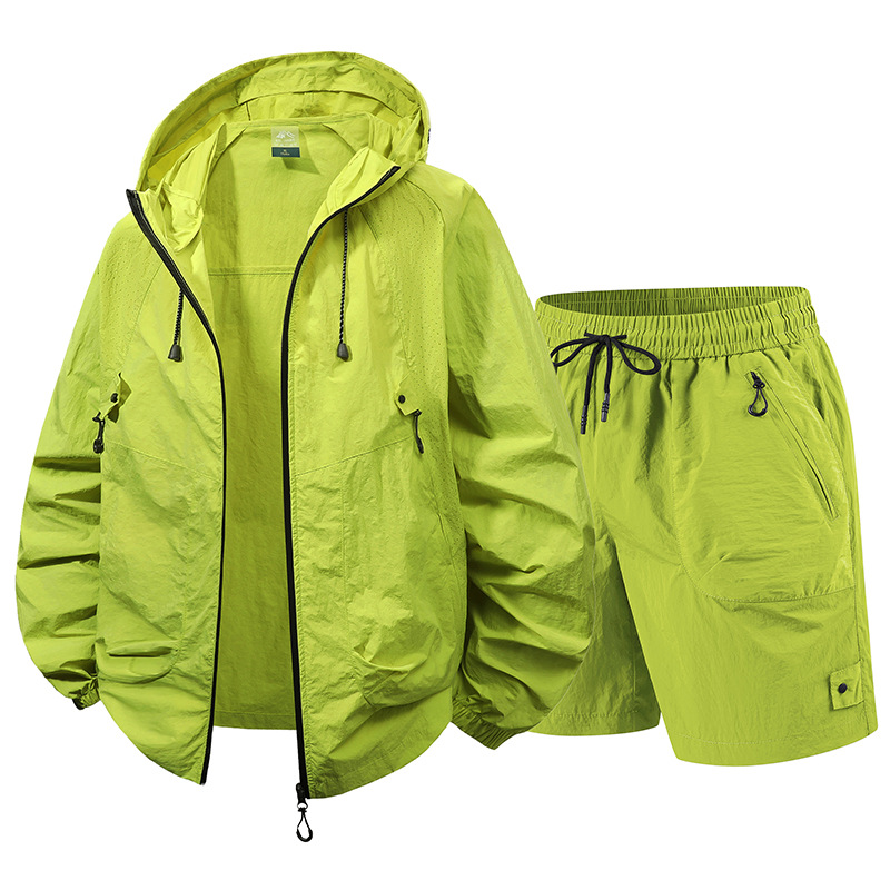 アイスシルクスーツメンズ夏メンズカジュアルスポーツ日焼け止めツーピースセット通気性速乾性ラウンドネックジャケットショーツ男性用