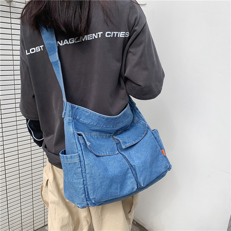 デニム女性カバンファッションシンプルレディースショルダーバッグ韓国版文芸学生キャンパス斜め掛けキャンバスバッグ大容量