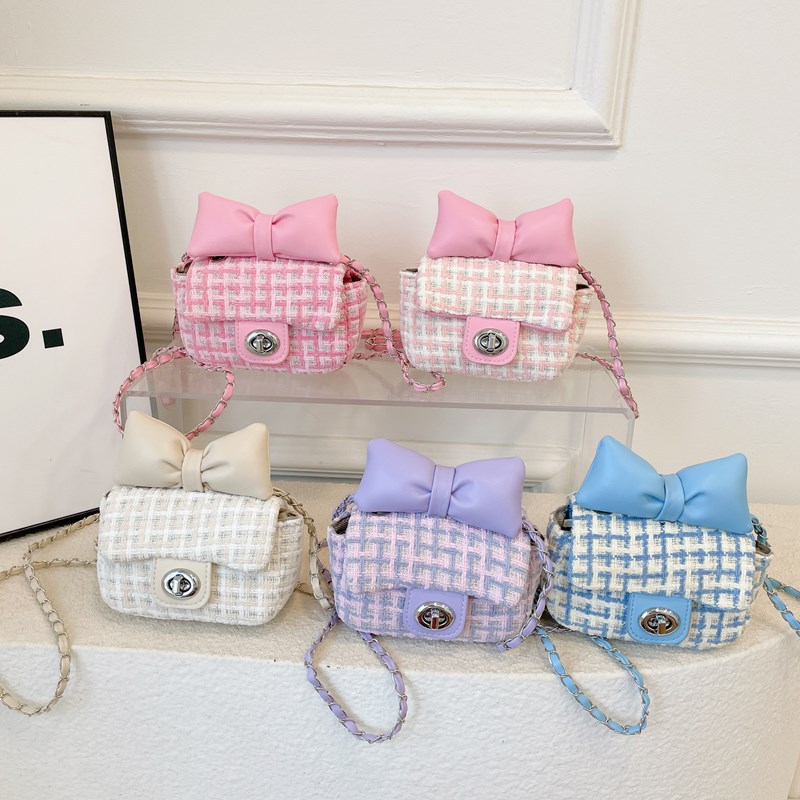 子供用バッグ潮金2024秋の甘い蝶結びの子供の斜め掛けバッグ洋気格子かわいい女の子バッグ