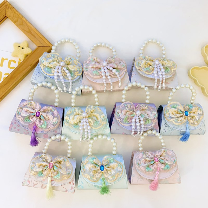 新型中国風フリンジ子供斜めショルダーバッグファッション蝶結び男女子供用ショルダーバッグ真珠アクセサリーハンドバッグ