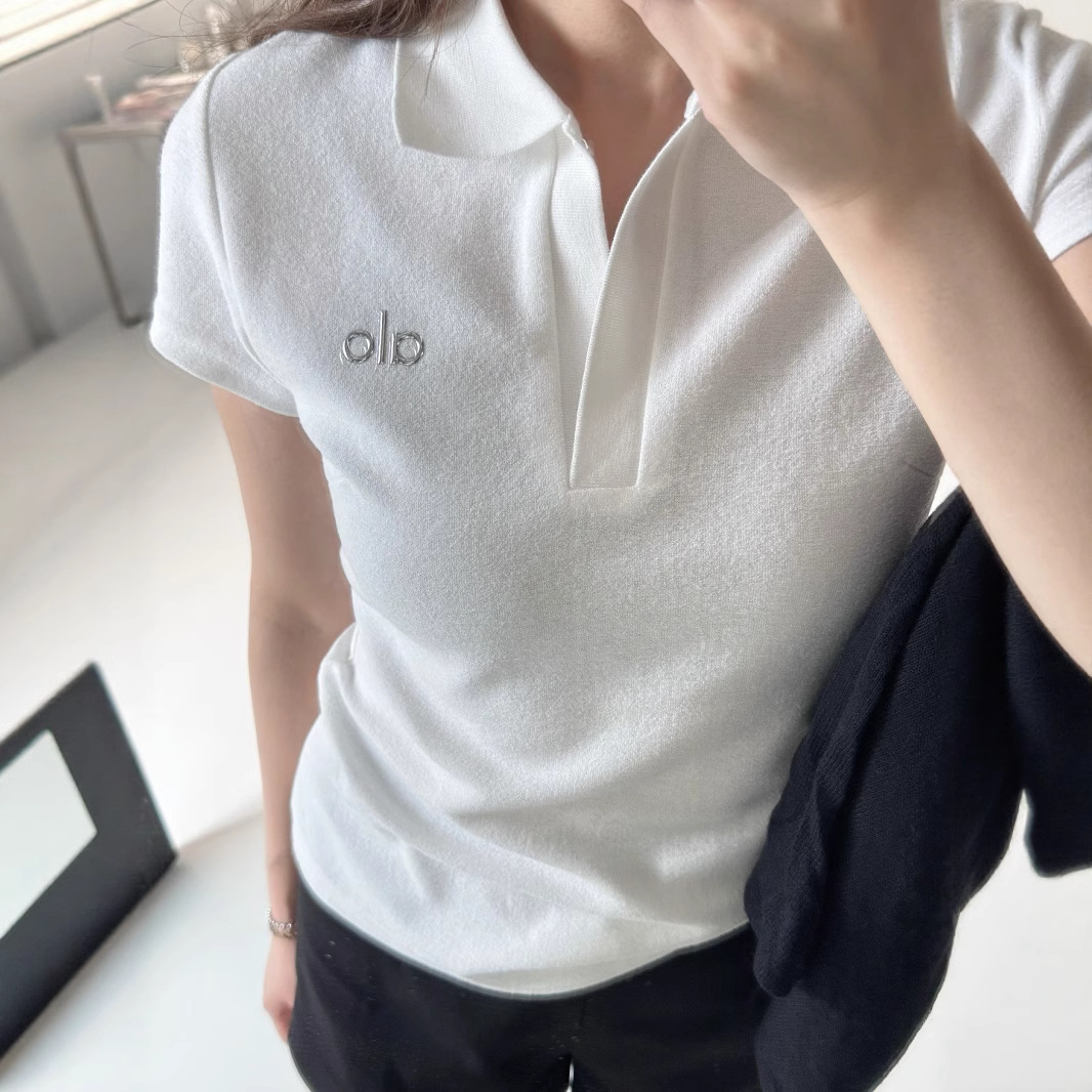 ALO 立体レターポロカラー半袖Tシャツレディース右肩スリムフィットカジュアルヨガスポーツトップ純綿