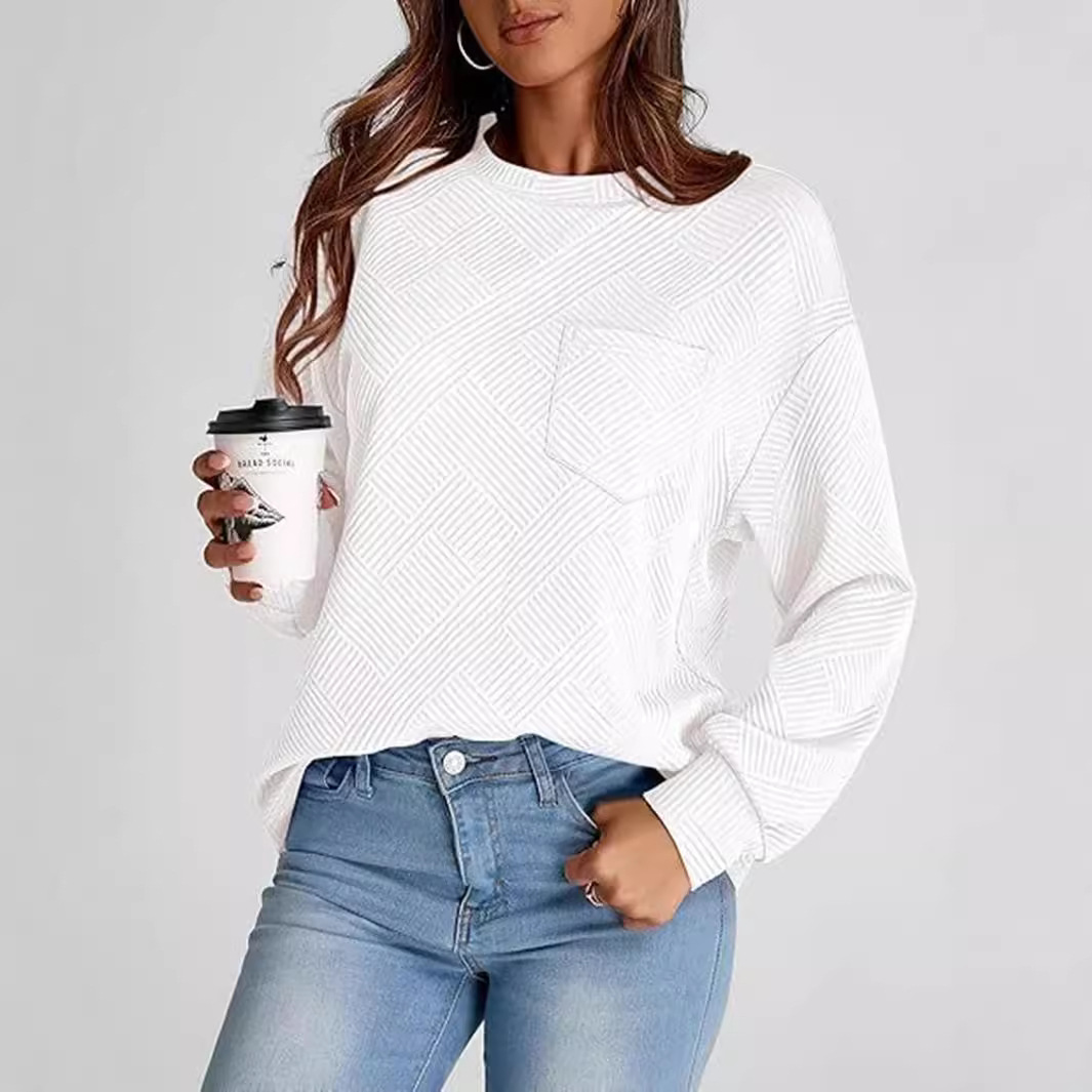 レディースニットジャカード長袖ラウンドネック胸元ポケットスポーツウェアカジュアルゆったりプルオーバーパーカー