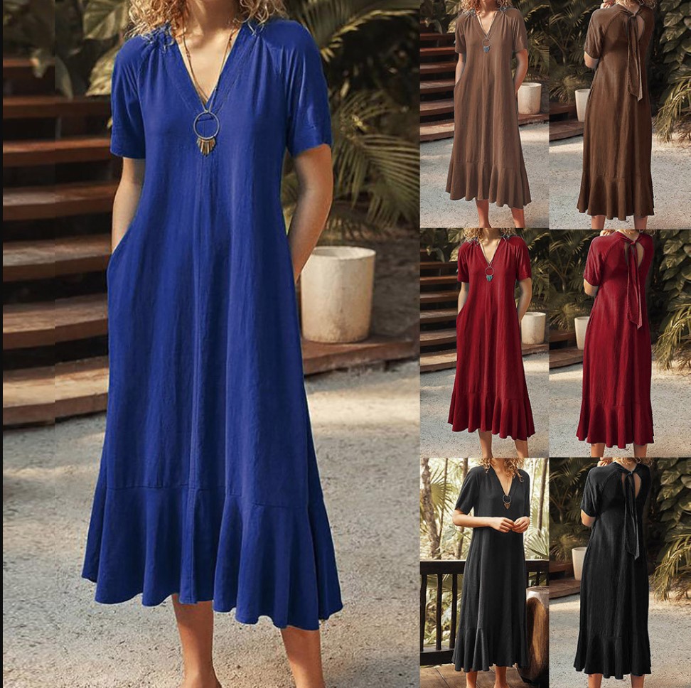 2023アマゾン欧米の国境を越えた新型の起爆女装純色vネック帯半袖綿麻a字長ワンピース