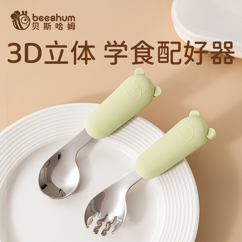 Beeshum大きい顔の熊の赤ちゃんのフォークのスプーンの乳幼児は食事の訓練を学んでスプーンの子供を食べて自主的にスプーンを食べます。