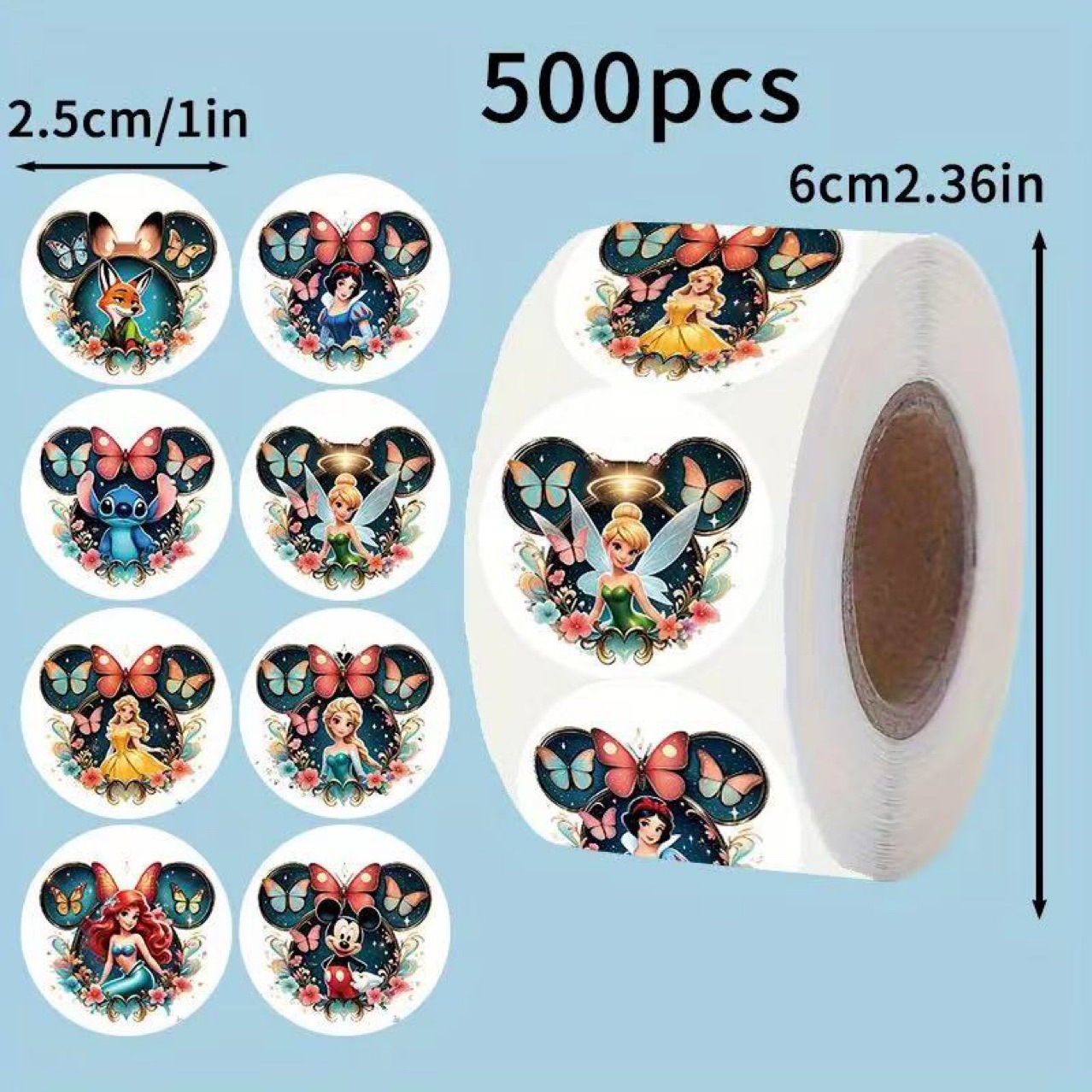アニメキャラクターのロールステッカー 500 枚、ステッチ、エルサ、ミッキーの漫画キャラクター、子供用のご褒美ステッカー、粘着式