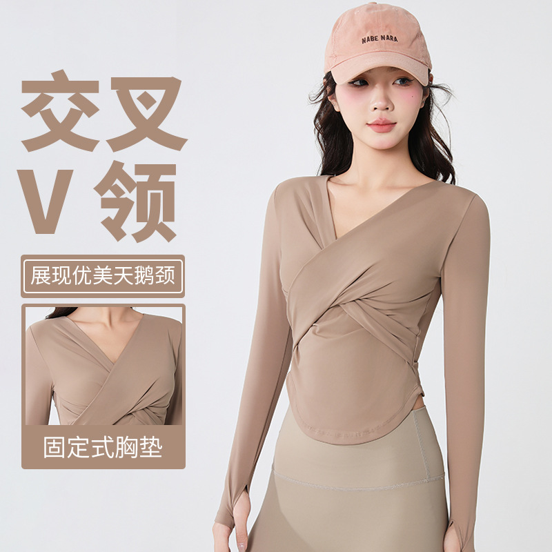 2024年Vネック固定式胸パッド入り着痩せヨガウェア レディース速乾トレーニングフィットネスウェア 長袖秋冬速乾通気性
