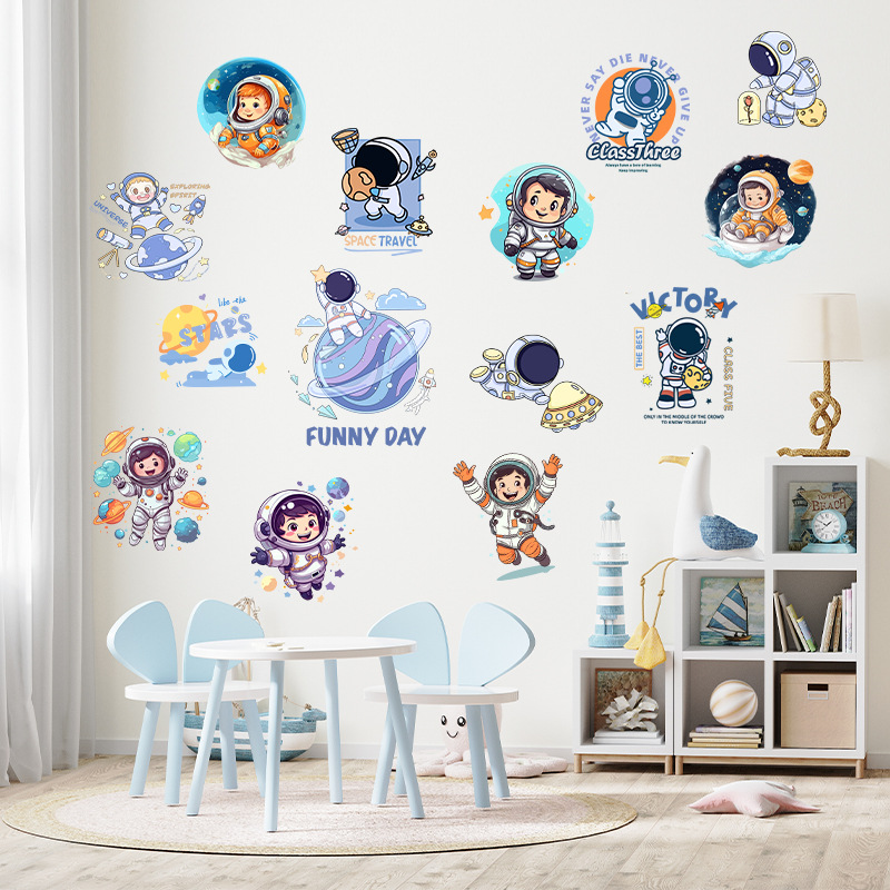 男の子の子供の部屋に壁紙の寝室の壁面を配置して漫画の宇宙飛行士のステッカーを飾って壁を飾って絵を貼ります。