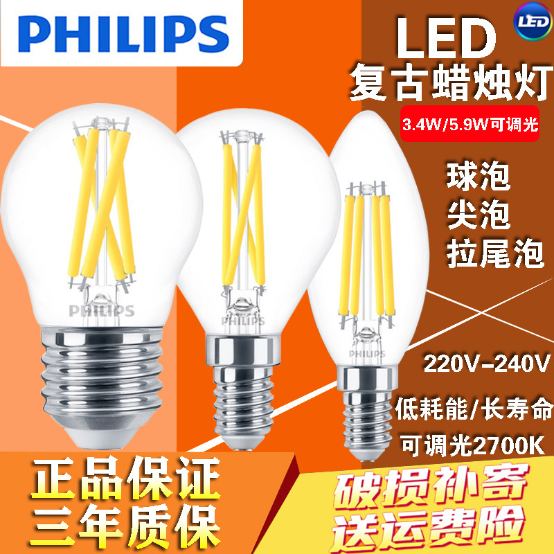 フィリップス2.5w3.4wクリスタルライト2700K光源エジソンタングステンライトLEDレトロ調光キャンドルライト