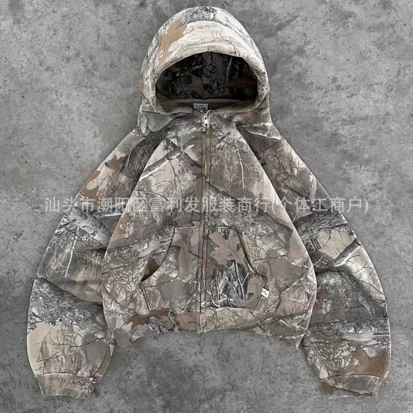 2024春秋新型アメリカ式高街レトロ男女迷彩楓葉衛衣デジタルファッション帽子衛衣カーディガン