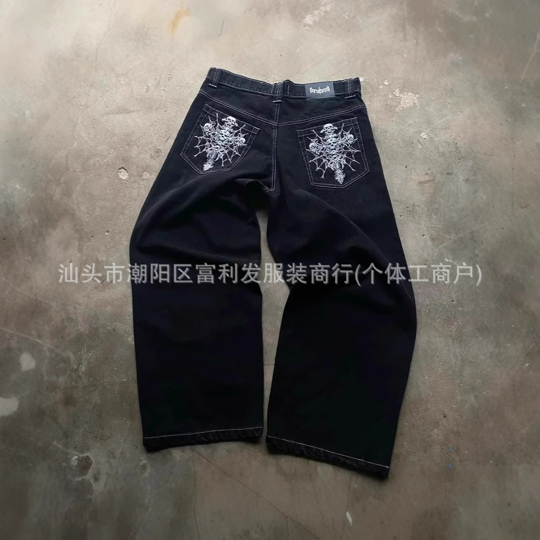 国境を越えたアメリカ街のレトロな頭蓋刺繍ゆるいジーンズhiphopヒップホップ街で古いワイドパンツを作る