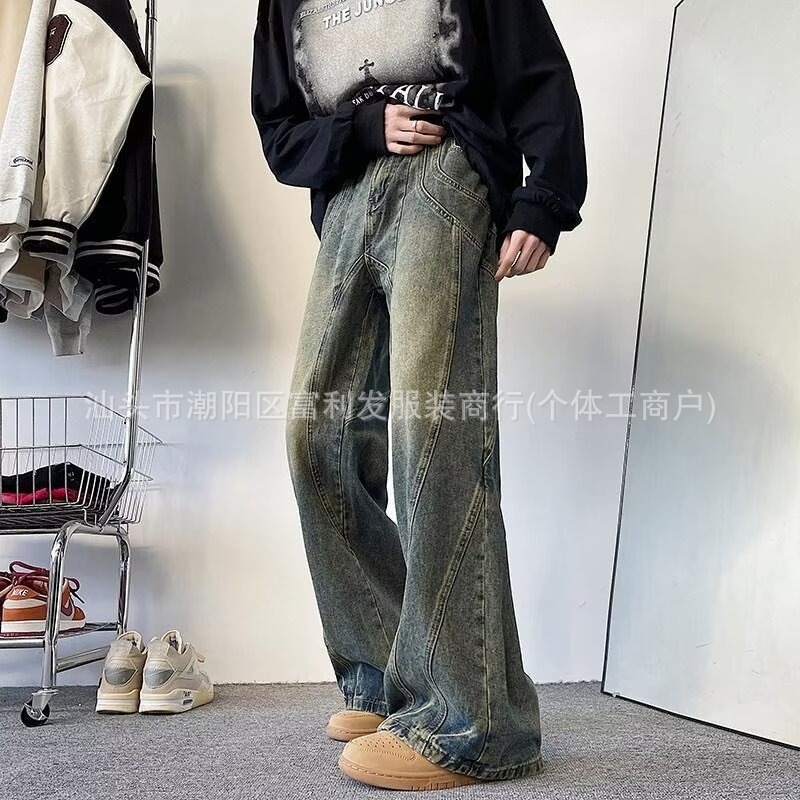 欧米の高街vibe風水洗いは古いアメリカの街頭の微ラッパのジーパンの男性の春夏の直筒のゆったりしているズボンをします。