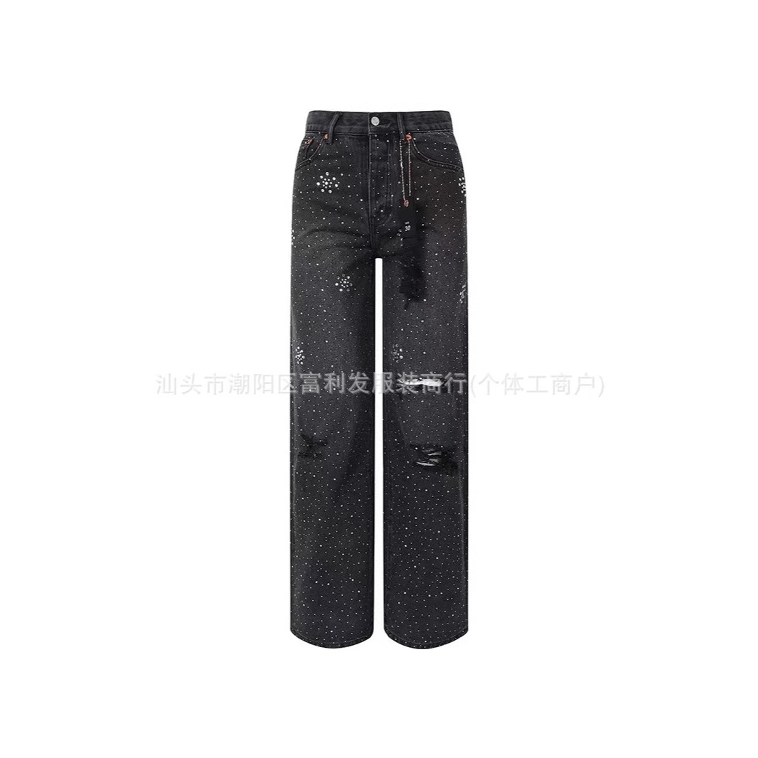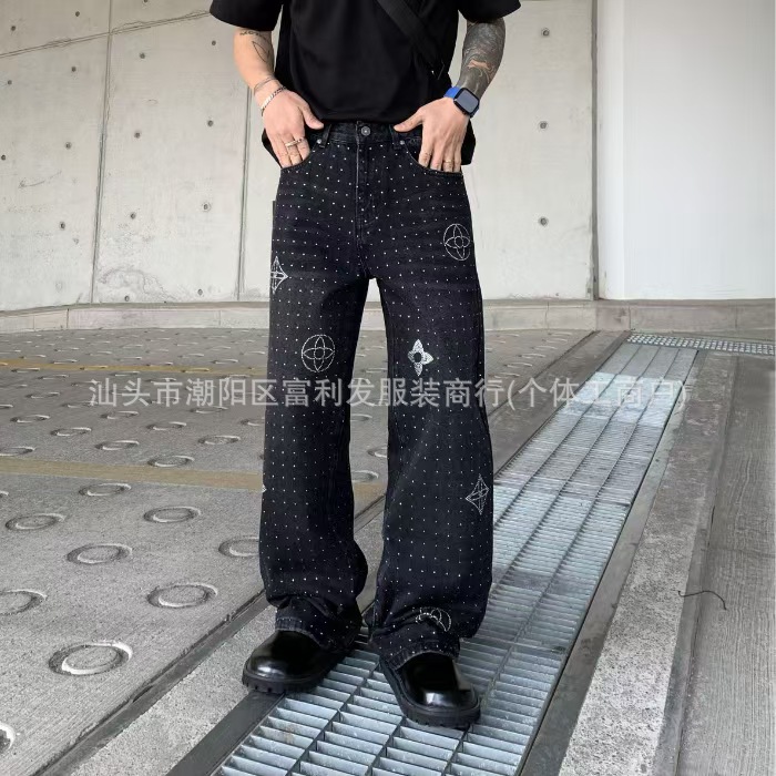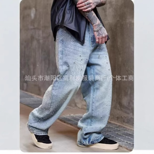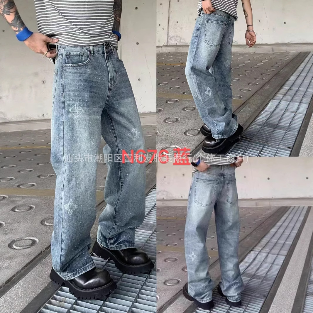 2024 夏の新香港スタイルストレートジーンズメンズ春アメリカンラインストーンプリントボーイズドレープカジュアルパンツ