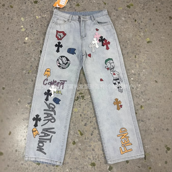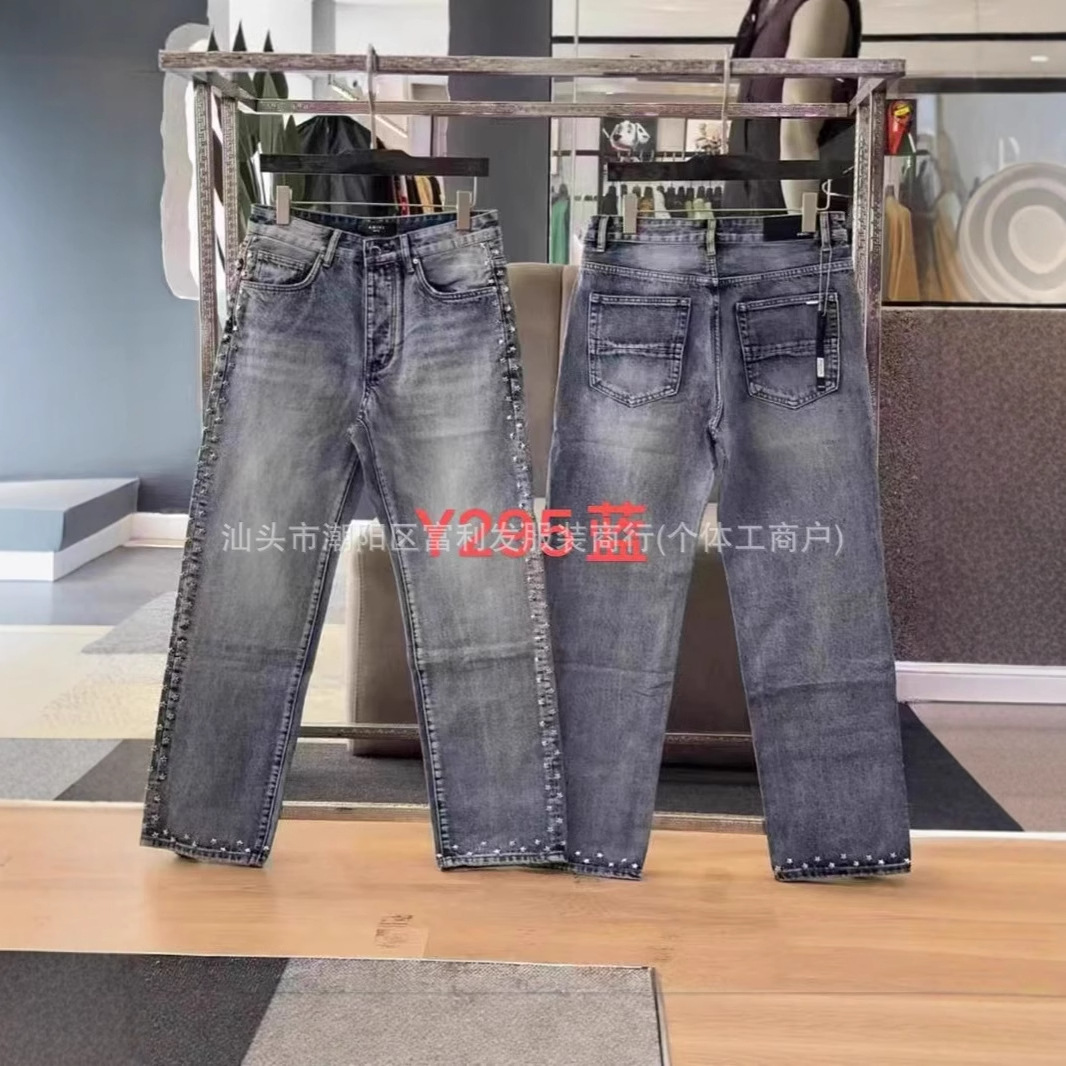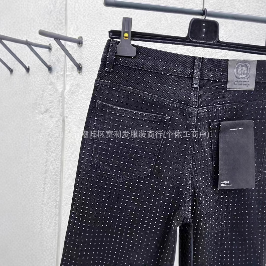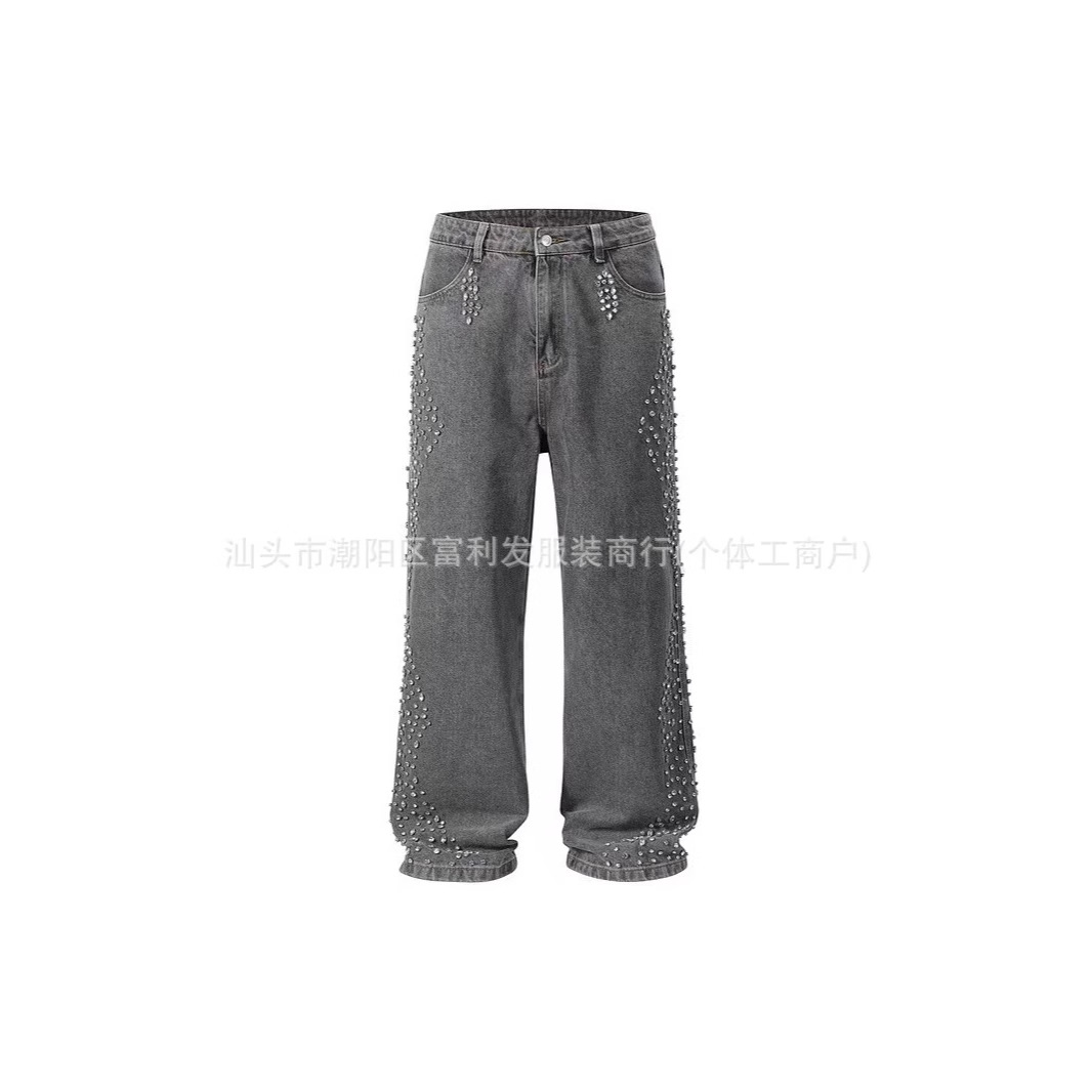 2024 夏の新香港スタイルストレートジーンズメンズ春アメリカンラインストーンプリントボーイズドレープカジュアルパンツ