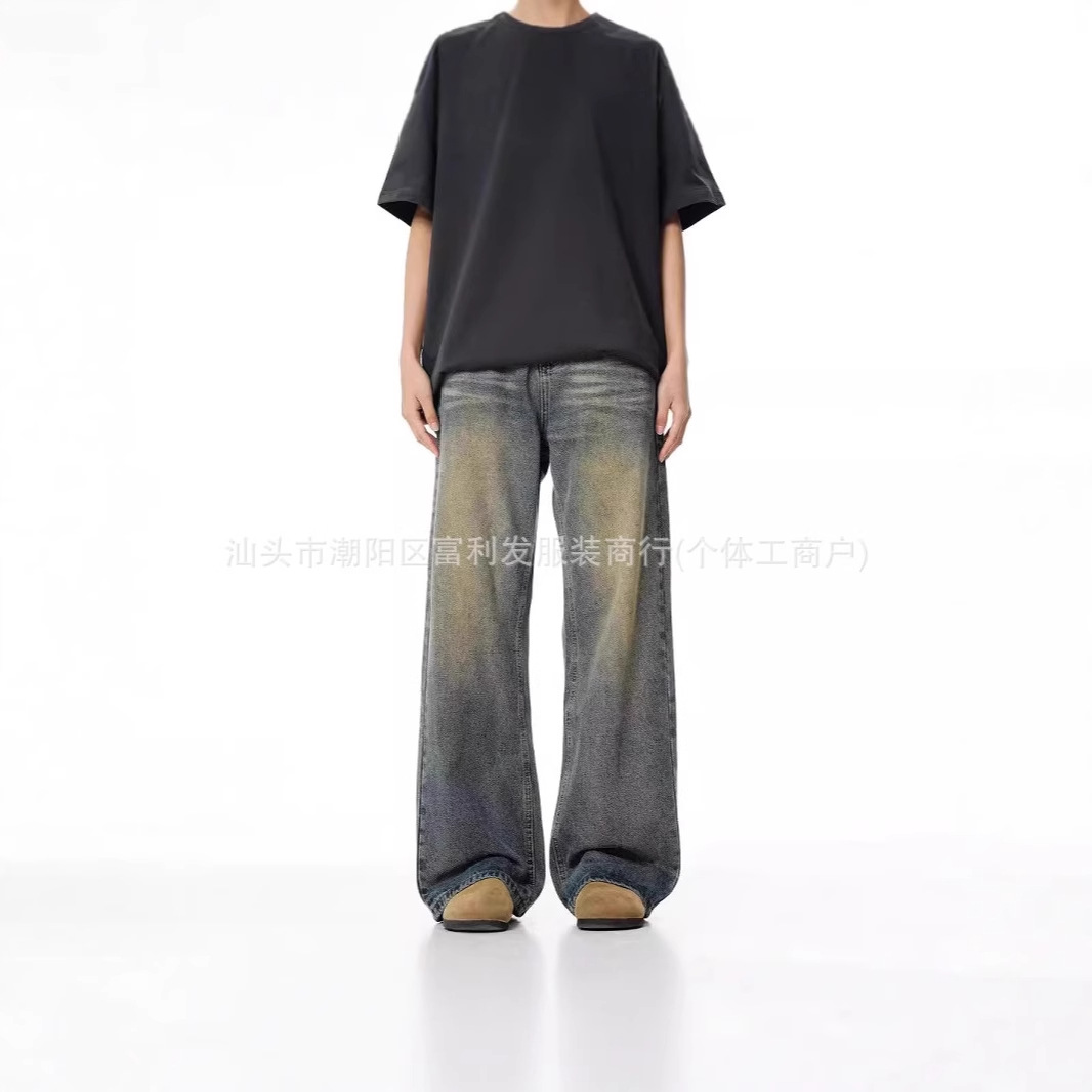 2025 夏の新アメリカンスタイルウォッシュドスリーパンツデザインパンツトレンディなルーズカジュアルストレートワイドレッグパンツ男性用