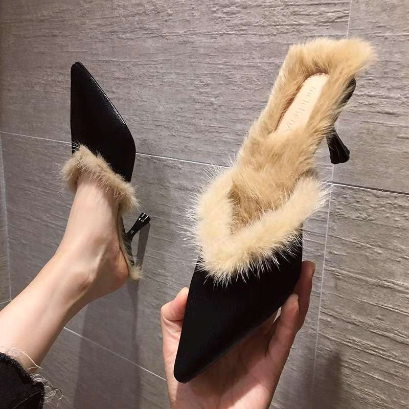 フレンチニッチハイヒールレディーススティレットポインテッドトゥファーハーフスリッパ2025新しい女の子の新鮮でセクシーなウサギの毛皮の靴