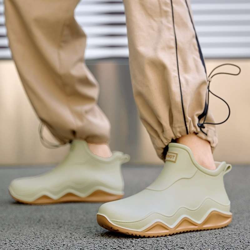 男性用のファッショナブルなショートレインブーツ、滑り止め防水靴、キッチンゴム靴、洗車工事現場の耐摩耗性ウォーターブーツ、ベルベットで暖かく保ちます。