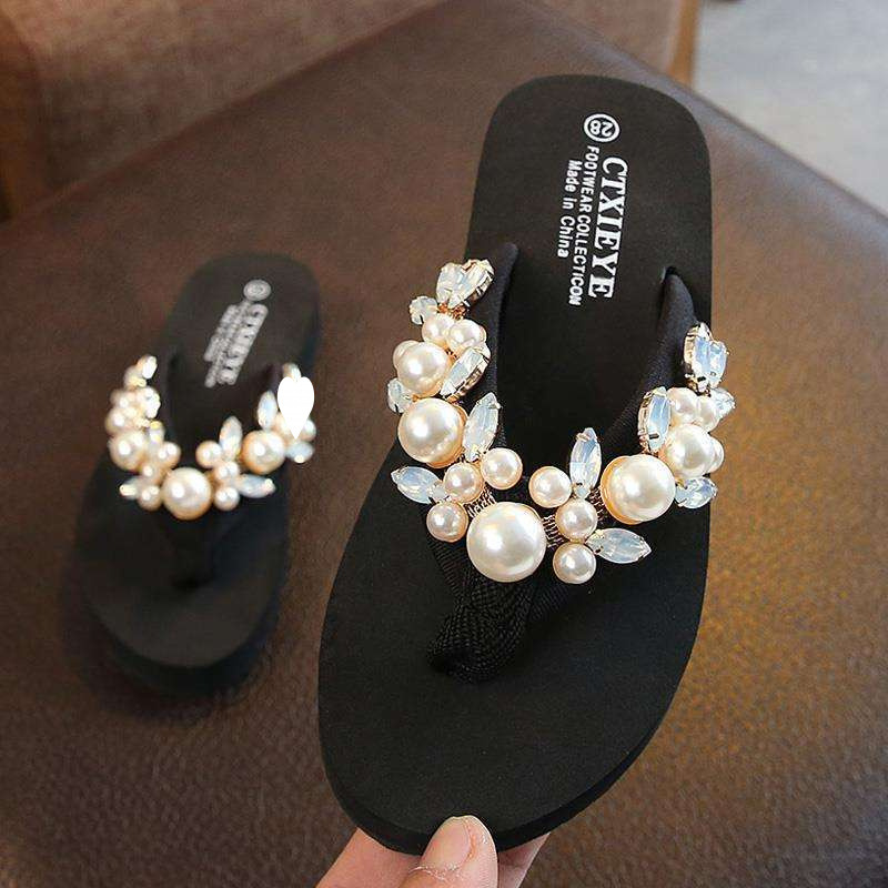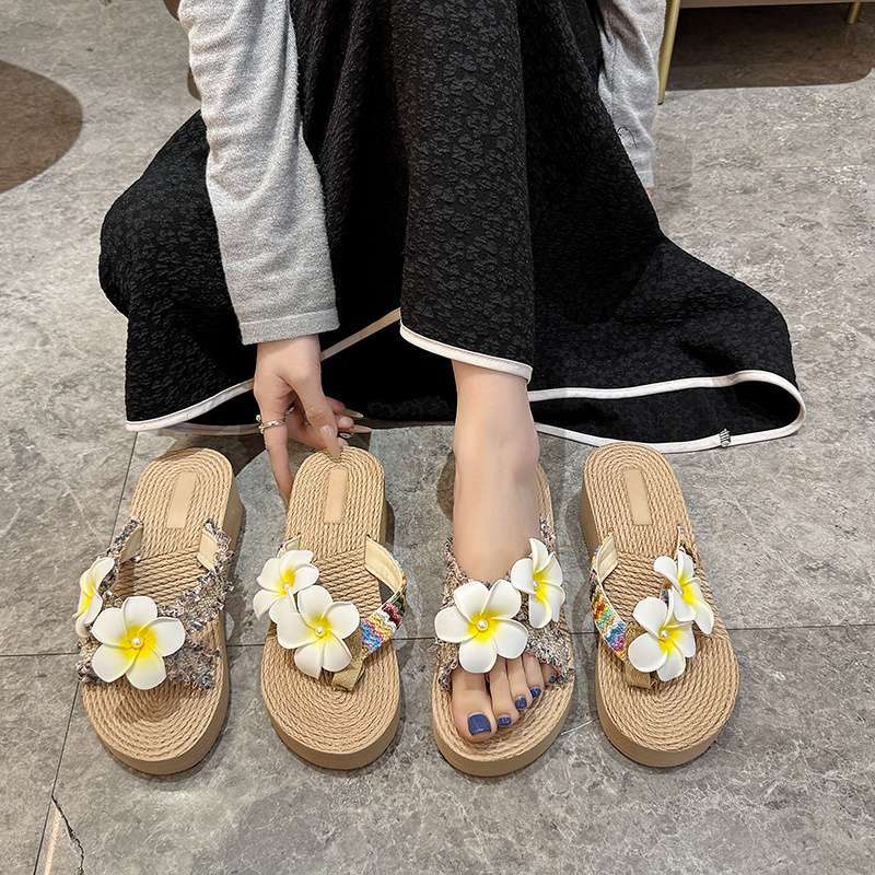 2025 夏の新スタイルフェアリースタイル高さ増加スリッパウェッジヘリンボーンファッション花厚底休暇ノンスリップビーチシューズ