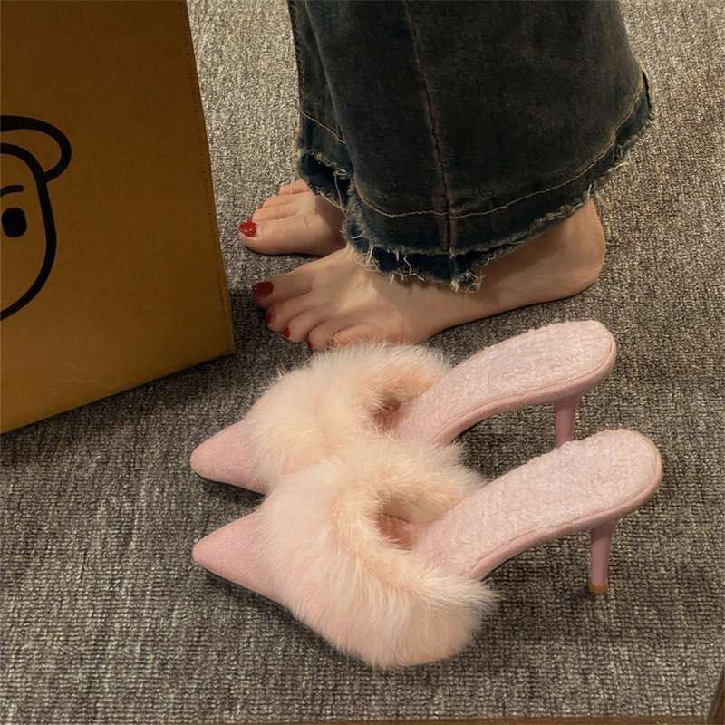 デザイン感/フレンチポインテッドトゥファースリッパ女性用アウターウェア2025春新スタイル万能ハイヒールつま先ハーフスリッパ