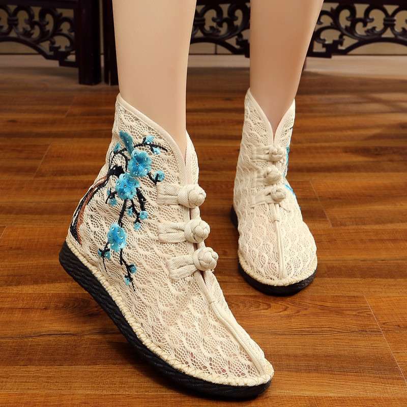 新しい古い北京布靴、女性用布ブーツ、レトロなハイトップショートブーツ、刺繍靴、サンダル、女性用メッシュブーツ、エスニックスタイルシングルブーツ