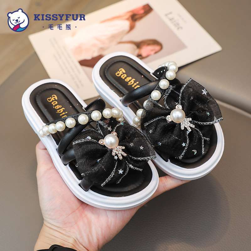 モコモコクマ女の子アウタースリッパ 2025 夏新パールプリンセスソフト底リボンノンスリップ子供サンダル