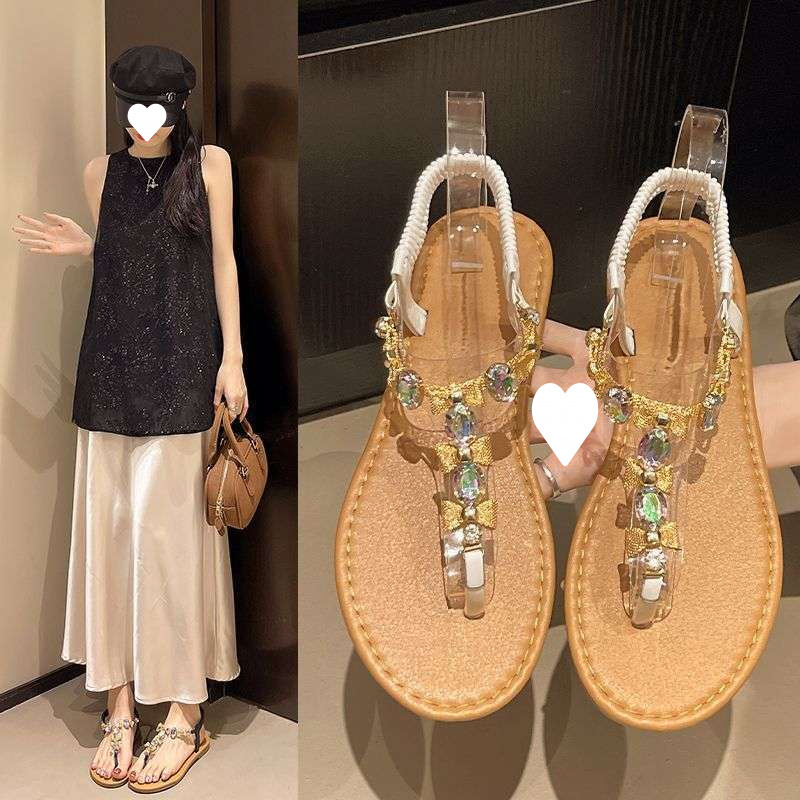 サンダル女性 2025 夏の新ボヘミアンフラット多用途ラインストーントングサンダルシーサイドビーチシューズ