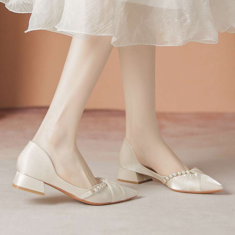 2025 クリスタルボウシャンパンゴールドシルバースモールサイズの婚約靴ローヒール太いヒールのブライズメイドシューズは日常着として着用できます