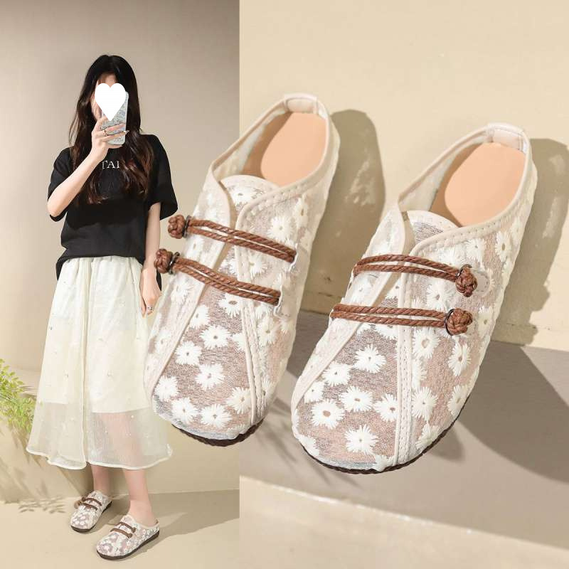 女性の靴 2025 夏の新ホットスタイルメッシュ刺繍花包頭スリッパ女性のフラットハーフスリッポンビーニーシューズ