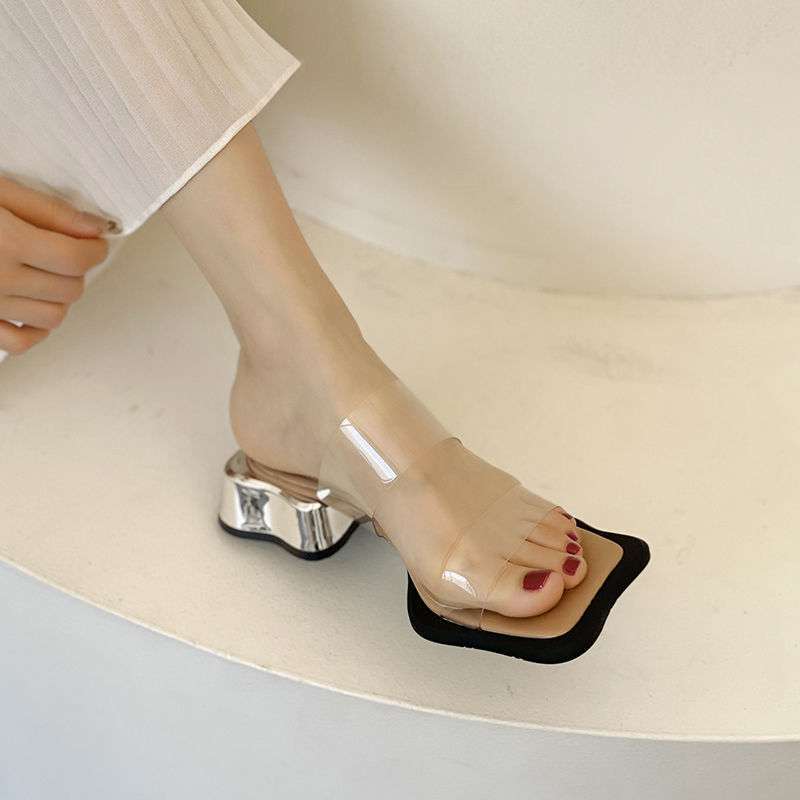 女性用厚底サンダル 2025年夏新作 インストレンド 透明ワンラインストラップ ニッチデザイン 万能アウタースリッパ