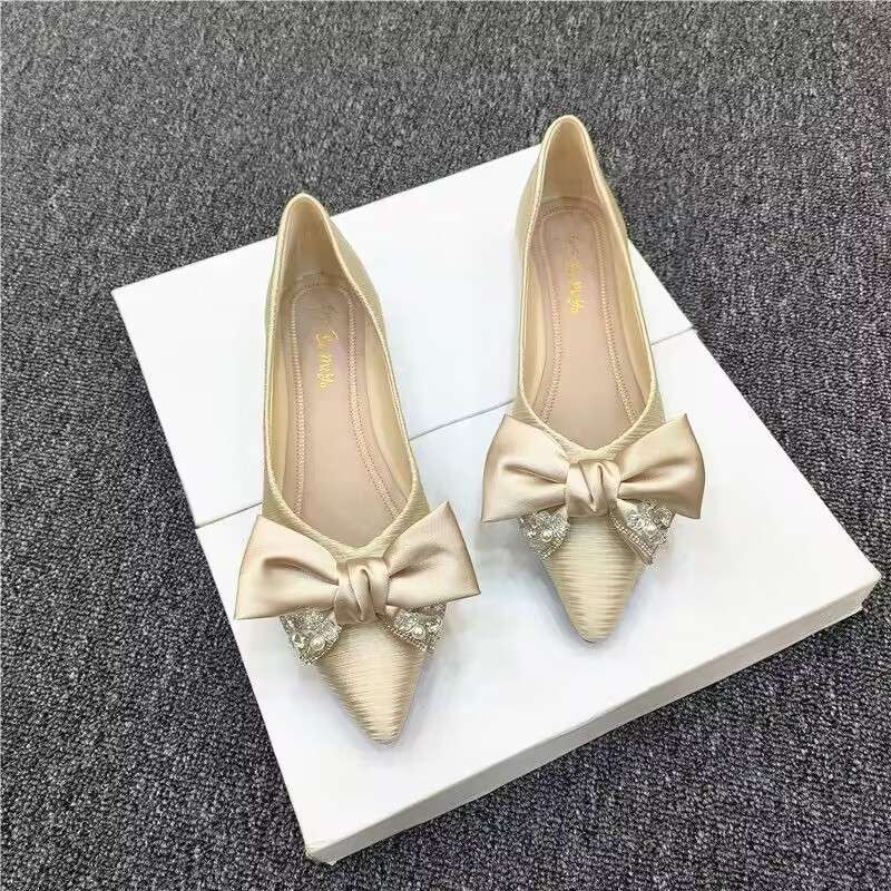 2025年夏新作フラット浅口レディースシューズ、万能フラットヒール、ソフトソール、蝶結び、ポインテッドトゥ、女性用秋靴