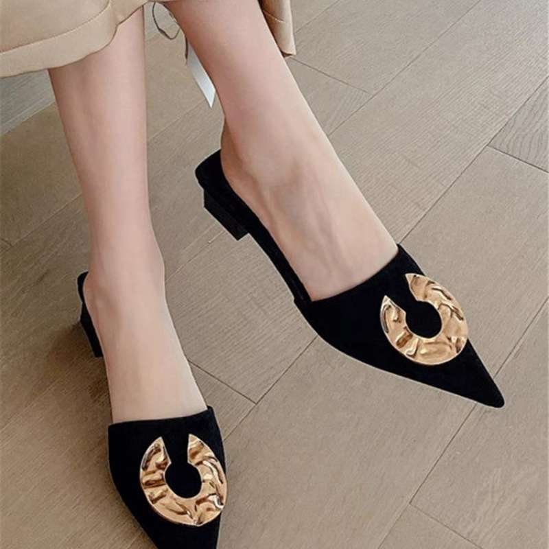 2025年春と夏のアウターウェアに万能なレディースシューズ、ポインテッドトゥ、太いヒール、ローヒール、トゥキャップハーフシューズ、レイジーミディアムヒールサンダル