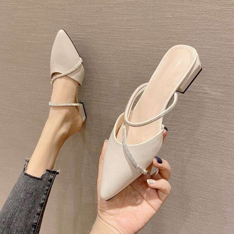 2025 夏の新スタイルフレンチエレガントなポインテッドトゥサンダルラインストーンストラップスリッポン厚いヒール包頭ハーフスリッパ女性のアウターウェア