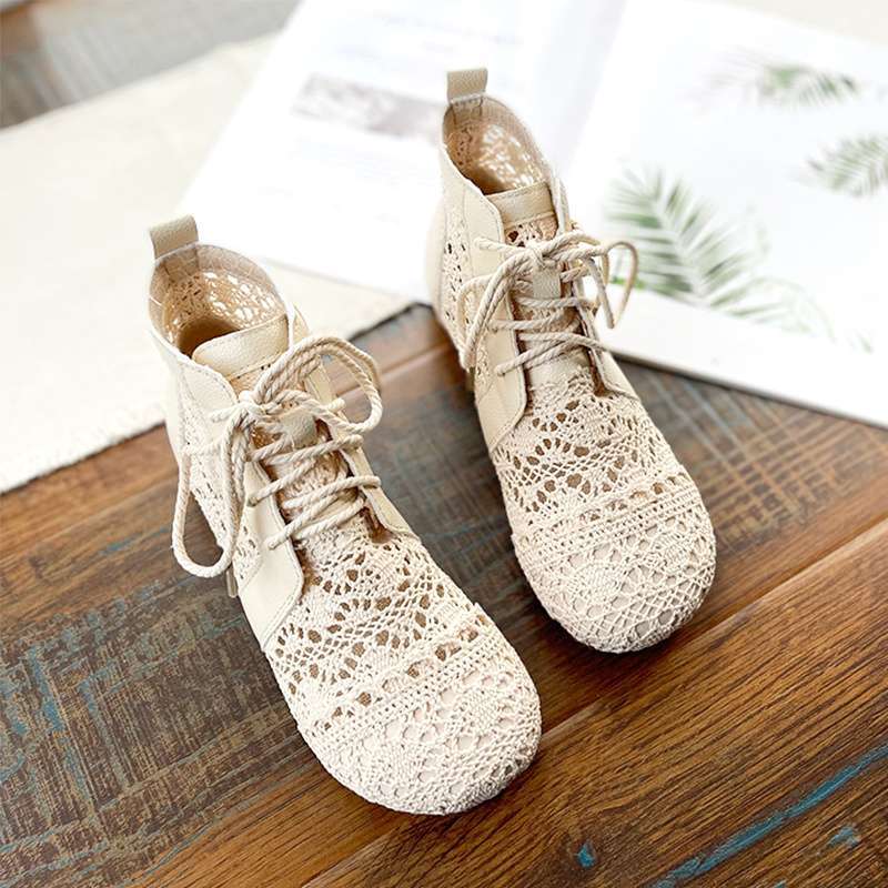 フォレストスタイル文学メッシュ中空サンダル 2025 夏の新スタイル織りフロントレースアップ平底つま先通気性サンダル女性用