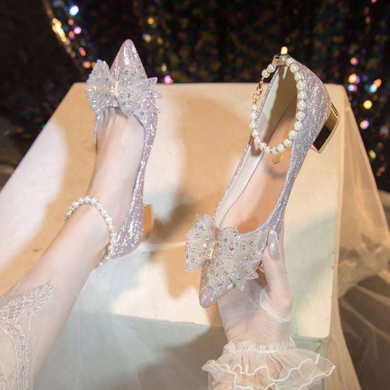2025 新しいハイエンドパールウェディングドレス Xiuhe ウェディングシューズブライダルシューズクリスタルリボンドレスシルバーハイヒールの靴女性