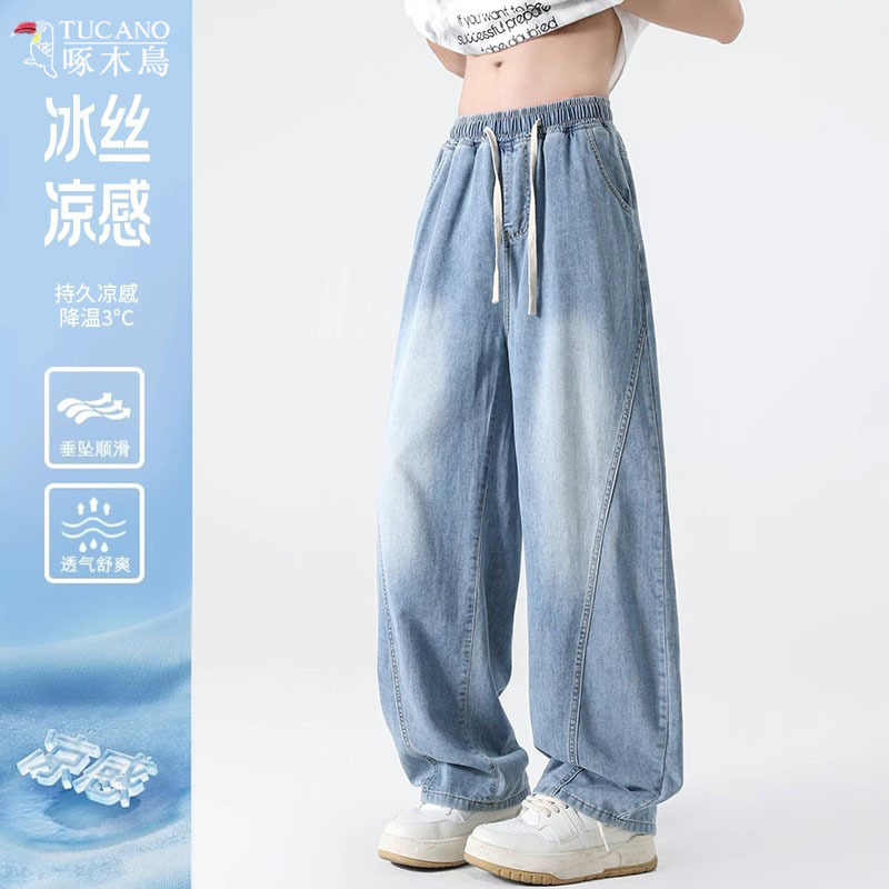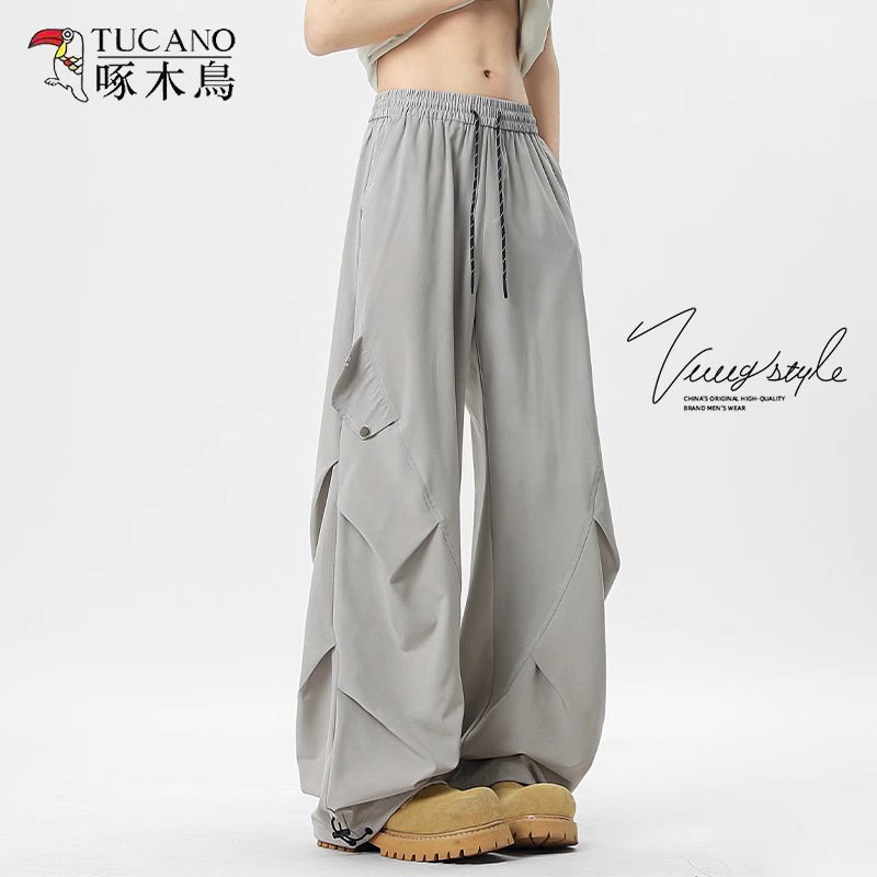 ウッドペッカーアメリカンハイストリートプリーツアイスシルクパンツメンズ夏薄いトレンディなルーズストレートカジュアルパンツ