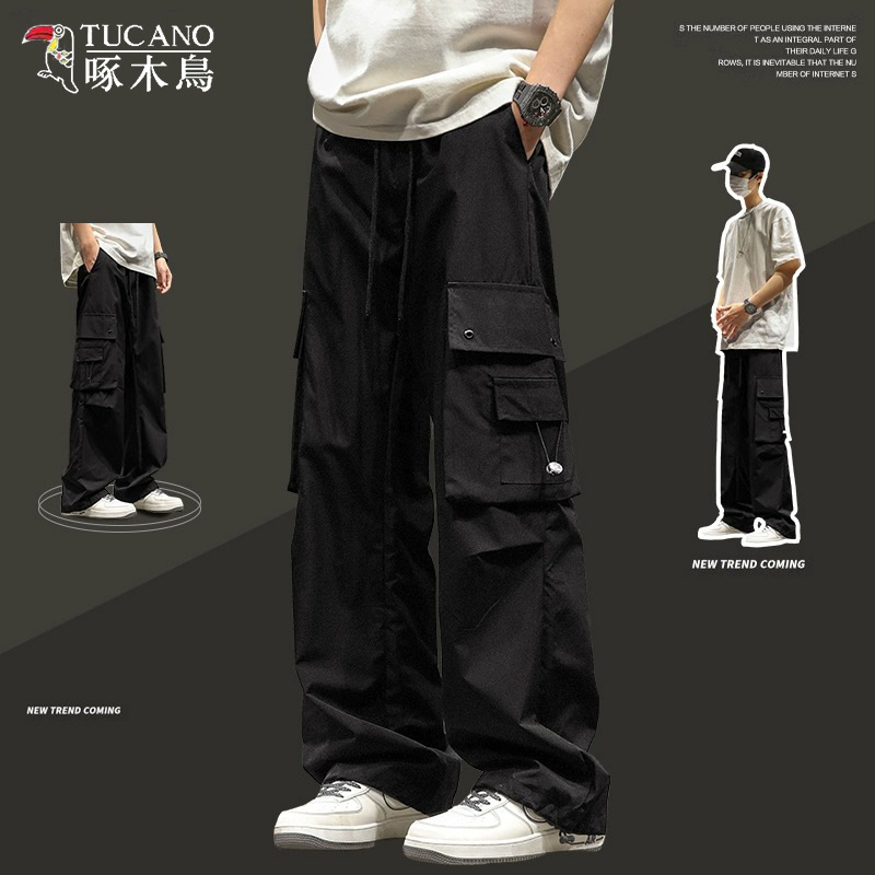 Woodpecker アメリカンブラックカジュアルパンツメンズ夏 2025 ルーズストレートワークウェアワイドレッグパラシュートパンツ男の子用