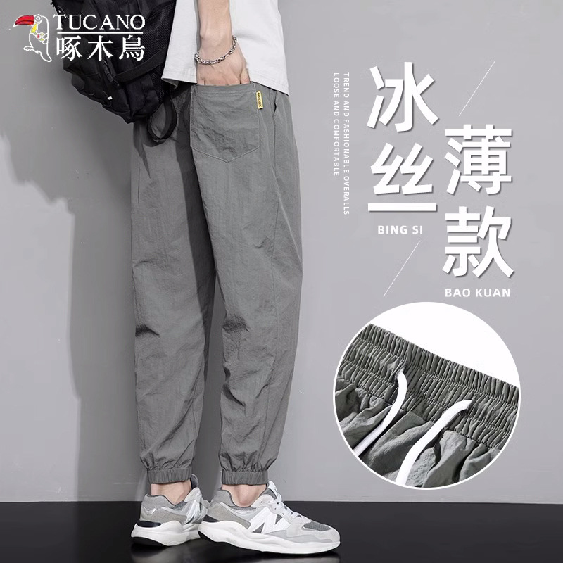 キツツキの氷の糸のカジュアルなズボンの男性の夏のゆったりした束の足の2025の新型の大きいサイズの速乾の9分のズボンの男性