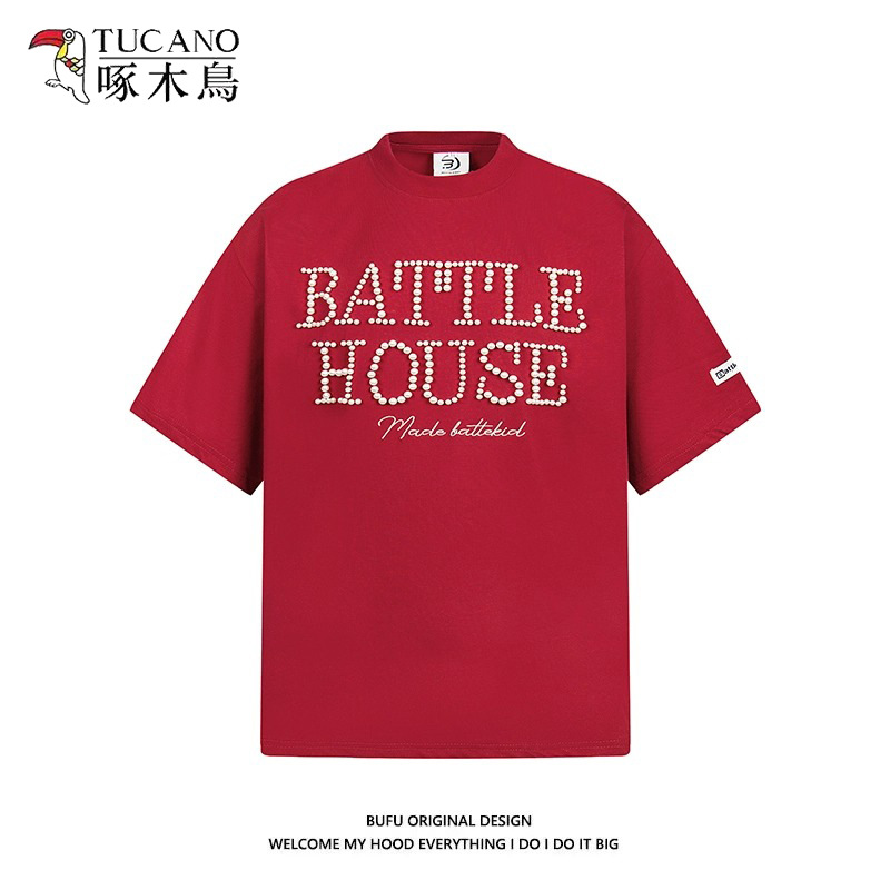 ウッドペッカーアメリカンレトロビーズレター半袖Tシャツ男女兼用夏カップル国民的ファッションブランドハイストリートTEE
