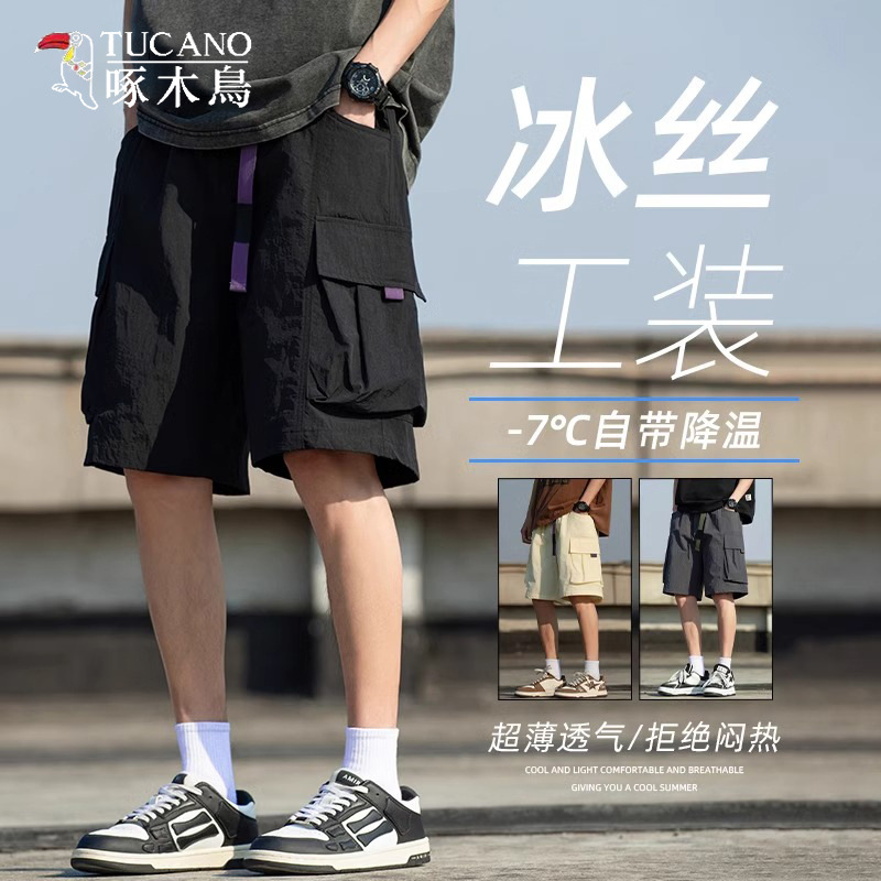 キツツキのアメリカ式氷糸工装半ズボン男2025夏潮牌ゆるいカジュアル速乾運動五分ズボン