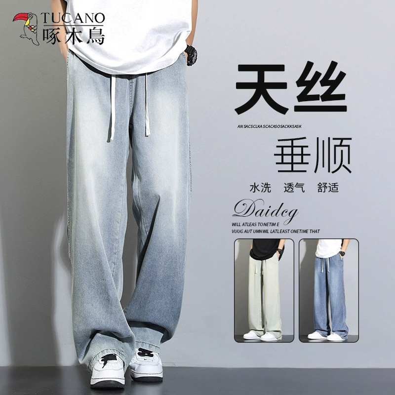 ウッドペッカーテンセルドレープジーンズメンズ夏薄い新しいレトロルーズストレートアイスシルクワイドレッグカジュアルパンツ